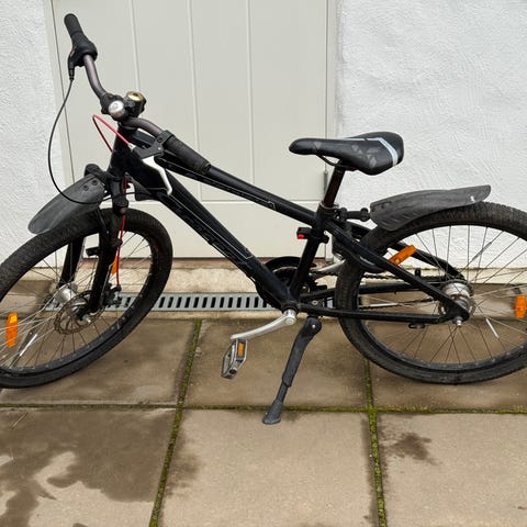 Barncykel med 24" hjul i svart färg med röda fälgar. Utrustad med handbroms fram, fotbroms bak. 3 växlar Nexus. Stänkskärm bak.