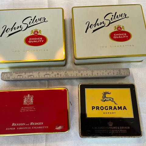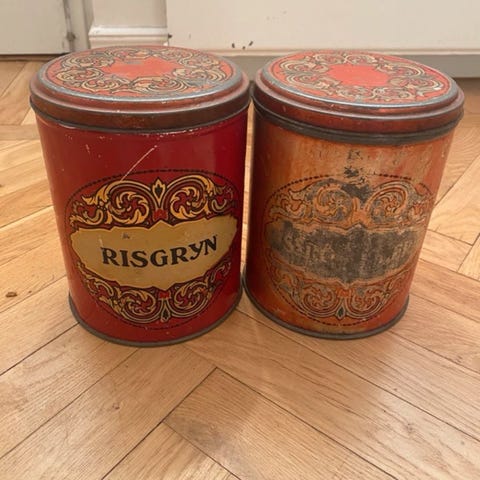 Aladdin plåtburk i röd färg med vit dekor och text. Burken är rektangulär och har lock. Passar till förvaring av exempelvis kakor, godis eller småsaker, eller som samlarobjekt och dekoration.