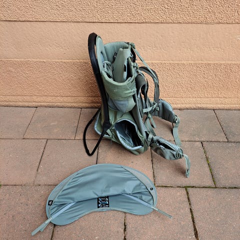Barnbärstolsryggsäck i blå och grå färg med inbyggt stativ. Utrustad med vadderad sits och ryggstöd för barnet samt justerbara axelremmar, bröstrem och midjebälte för bäraren. Integrerat solskydd/tak över barnsätet.