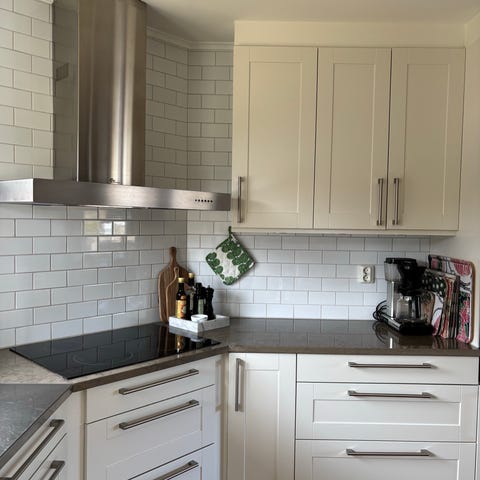 Köksskåp i vit färg med släta luckor och lådor samt rostfria handtag. Överskåp med både hela luckor och vitrindörrar med glas. Underskåp med flera lådor ger förvaring för köksredskap och porslin. Bänkskiva i mörk ton löper längs arbetsytorna, inklusive hörnparti. Köket har diskbänk med dubbelho och blandare samt integrerade platser för vitvaror som diskmaskin, kyl, frys, ugn och mikro.