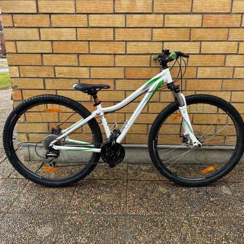 En grå/vit/rosa White mountainbike, 24 tum. Utrustad med dämpad framgaffel och skivbromsar.