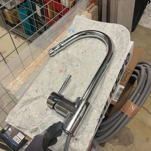 Köksblandare med diskmaskinsavstängning och hög pip i kromutförande. Enkelt reglage med ettgreppsblandare på sidan. Blandaren monteras i bänkskiva med håldimension 40 mm. Totalhöjd 487 mm och utsprång från centrum till pip är 210 mm. Levereras med anslutningsslangar och monteringsdetaljer enligt bilderna, lämplig för kök eller tvättstuga. Rek pris 5495 :-.