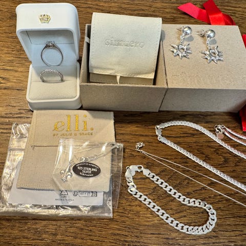 Säljer en samling smycken och ett silverfärgat armbandsur. Levereras i ett snyggt smyckeskrin.