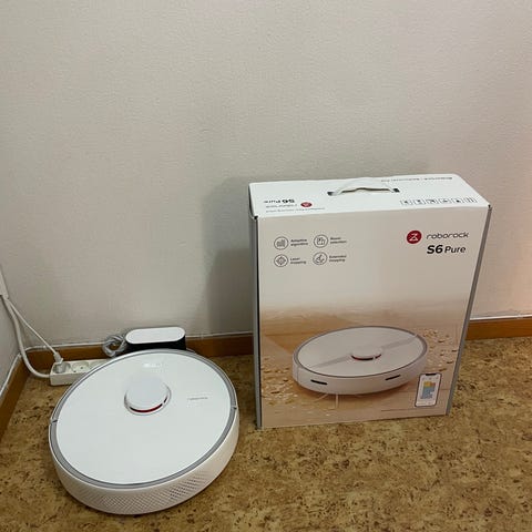 Roborock robotdammsugare med laddstation i vit färg. Modellen står i en dockningsstation som även fungerar som laddare. Robotdammsugaren är avsedd för automatisk städning av golv i hemmet och kan användas på hårda golv och mattor.