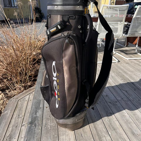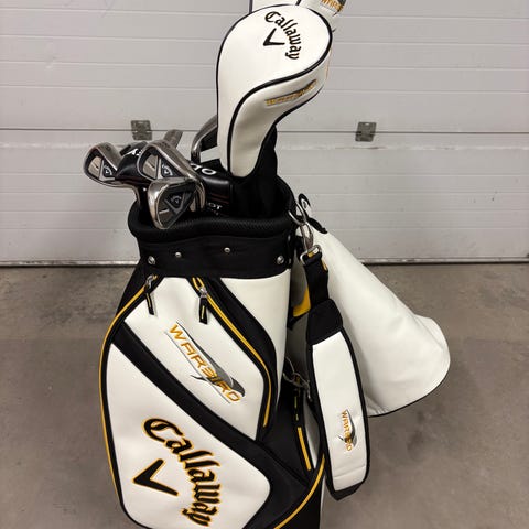 Callaway golfbag i svart färg med vit logotyp. Tourmodell, 6-deviders, slitage finns, alla kedjor hela, Bärrem. Några år på nacken därav priset.