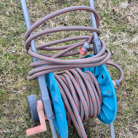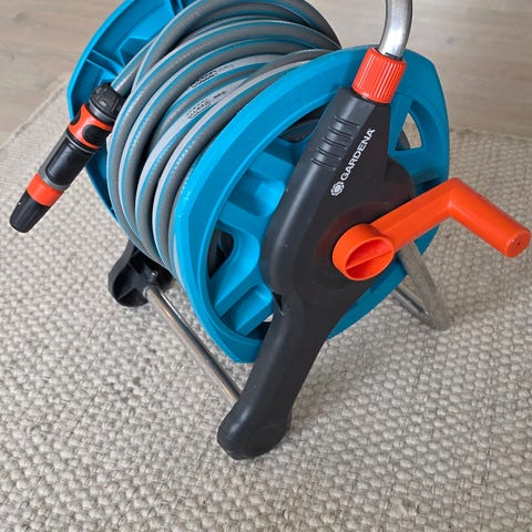 Gardena slangvagn med trädgårdsslang och spridarvagn