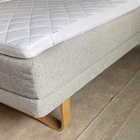 Jysk Dreamzone säng med grått tygklätt underrede och Wellpur bäddmadrass. Sängen består av en resårdel i textilklädsel med träben och en lös bäddmadrass ovanpå. Bäddmadrassen från Wellpur har avtagbart överdrag med dragkedja. Passar som enkel- eller dubbelsäng beroende på mått. Lämplig för sovrum eller gästrum.