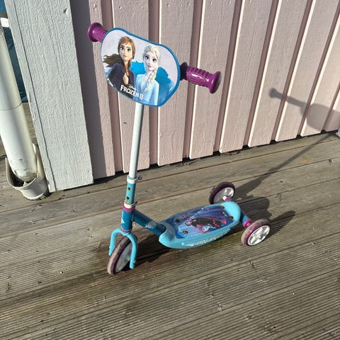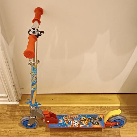 Marvel Spiderman sparkcykel i blått och rött. Motivet med Spiderman finns på fotplattan. Styret har röda skumhandtag och höjden är justerbar. Sparkcykeln har två hjul i plast med röd färg och en fotbroms över bakhjulet. Passar barn som vill ha en enkel tvåhjulig sparkcykel med Spiderman-tema för lek på plana underlag utomhus eller inomhus. Klistermärket på stången något avskavt, går bra att ta bort. Endast avhämtning i Hägersten.