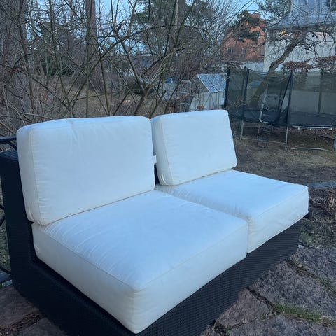 Soffa för uteplats med trästomme och lösa svarta sitt- och ryggdynor. Soffan består av flera moduler som kan placeras tillsammans som hörnsoffa eller separat som enskilda sittplatser. Passar för balkong, altan eller annan uteplats. Trästommen ger en stabil bas och dynorna ger mjukare sittkomfort. Dynöverdragen är i svart/grå textil.