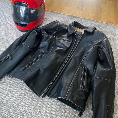 Halvarssons mc-ställ i skinn storlek UK 40 / F 44. Stället består av svart skinnjacka och matchande skinnbyxa med bälte. Jackan har flera ytterfickor med dragkedja, broderad logotyp på bröstet samt fodrad insida med tryckt emblem. Byxan är i samma svarta skinnmaterial med flera fickor och förstärkningar. Stället är avsett för motorcykelåkning och ger ett heltäckande skinnskydd för över- och underkropp.