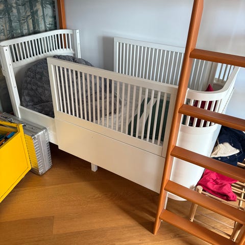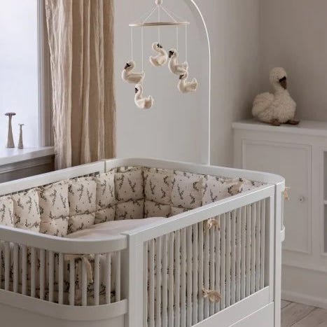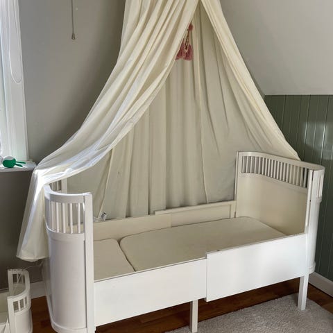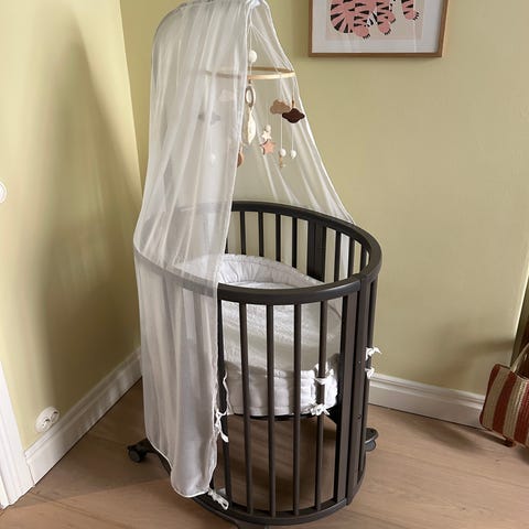 Sebra spjälsäng med sänghimmel. Spjälsängen har klassiska spjälor runtom och är placerad mot vägg. Sängen är rektangulär med rundade hörn och visas här med madrass och textil sänghimmel i ljus, neutral ton. Passar som sovplats för spädbarn och småbarn i barnrum eller sovrum.