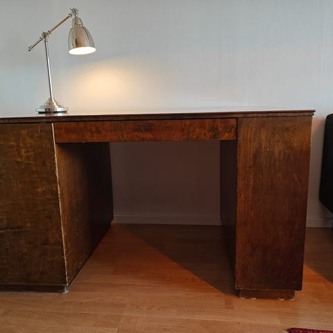 Skrivbord i trä i brun färg. Klassisk modell med två skåp på sidorna och utdragslådor upptill. Plan ovansida som passar för arbete, studier eller som datorbord. Bordet är fristående och kan placeras mot vägg eller fritt i rummet.