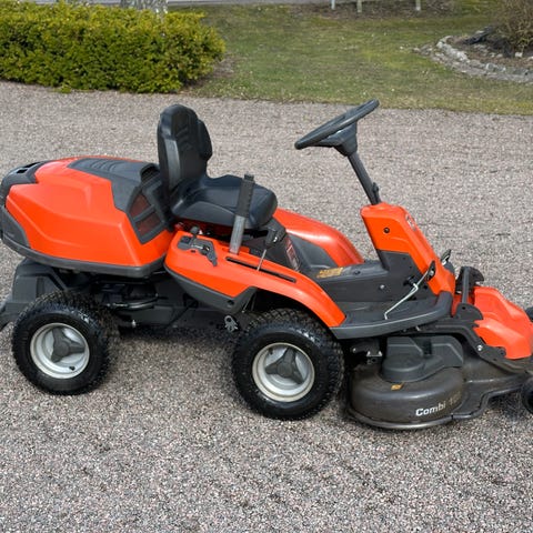 Husqvarna åkgräsklippare med uppsamlare. Modellen är bensindriven och har frontmonterat klippaggregat. Maskinen är utrustad med timräknare och har integrerad uppsamlare baktill för insamling av gräsklipp. Passar för klippning av större gräsytor där man vill samla upp klippet i behållare. Sits och reglage är utformade för att föraren ska kunna köra och manövrera klipparen sittande.