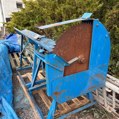 Okänd vedkap med cirkelsågblad och inbyggd transportör. Maskinen står på en stålram med hjul för förflyttning. Utrustad med elmotor, skyddskåpa runt sågbladet samt kedjedriven matning. Lämplig för kapning och hantering av ved eller liknande material. Märke, modell, effekt och exakta mått är okända.