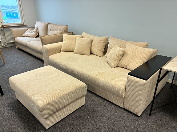 Soffan har synliga fläckar på sittkuddar, en är en kaffefläck som inte gick bort i vanlig tvättmaskin, det finns också en mörkare streck över den andra sittkudden. Vänligen se bilder.