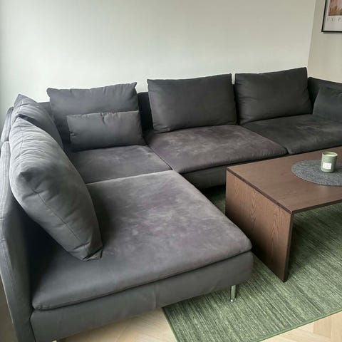 IKEA soffa i hörnmodell med schäslong, formgiven av Alberto Meda. Klädsel i mörkgrå textil och flera lösa rygg- och prydnadskuddar i matchande färger. Soffan har metallben och är avsedd för vardagsrum eller liknande sällskapsytor där flera personer kan sitta bekvämt.