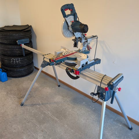 Verktygsvagn med monterad kap & gersåg från Bosch. I vagnen kan man ha allehanda verktyg samt möjlighet att koppla in ström för att ladda batterier. Du kan även koppla in ström till grenuttag för att försörja andra maskiner. Utdragbara armar för att få bra arbetsyta. Kap & gersågen har laser för tydlig syn av det som skall kapas.