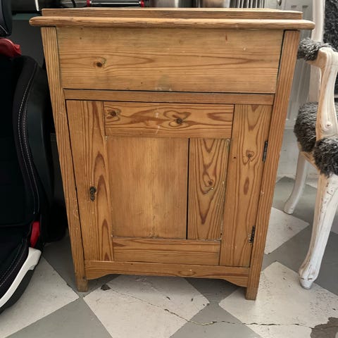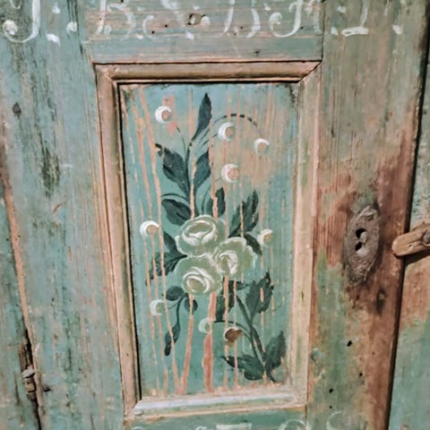 Blåmålat träskåp med en dörr och enkel blommålning på fronten. Skåpet har en inre hylla för förvaring och står på små ben. Insidan är omålad i naturträ. Färgen är sliten på flera ställen vilket ger ett patinerat utseende.