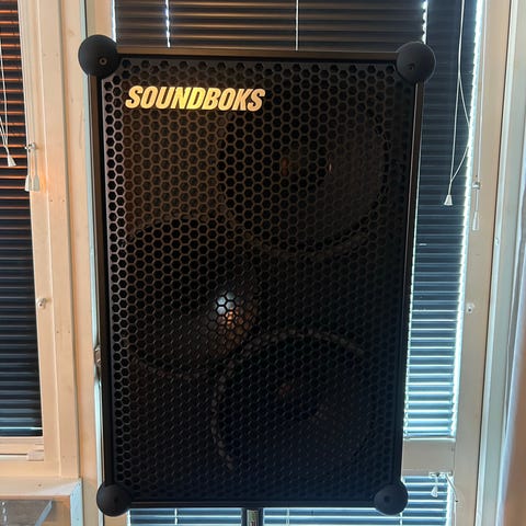 2st baslådor i botten 🔈med tillhörande topphögtalare på sk dansbandspinne som man sitter emellan baslåda och topphögtalare.
