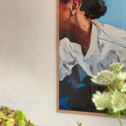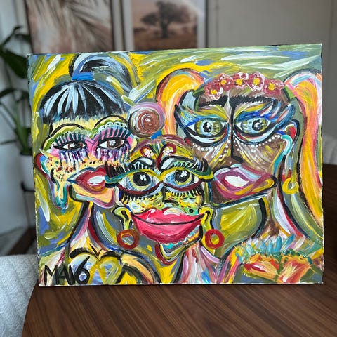 Unik akrylmålning av kvinna i randig jacka i Mid century modern stil. Den ska symbolisera den starka kvinnan. Det finns bara en av denna (original). Storlek 50x70. Ram ingår ej men det finns bra ram på Ikea som denna går in i till billig peng.