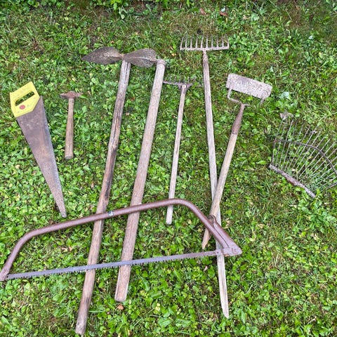 Äldre rejäla rädgårdsredskap spadar grep och hacka