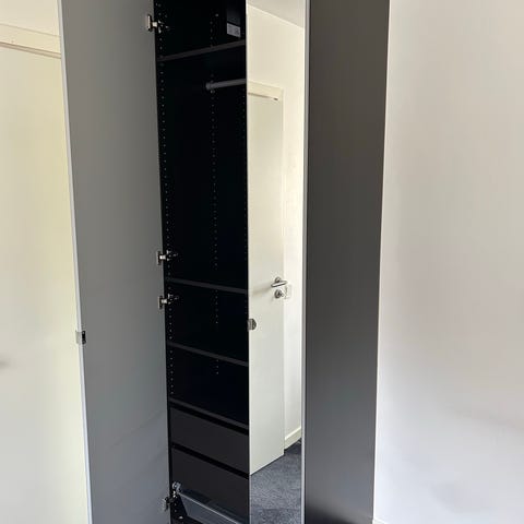 Pax garderob med en spegeldörr och belysning