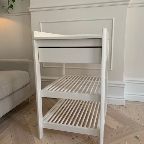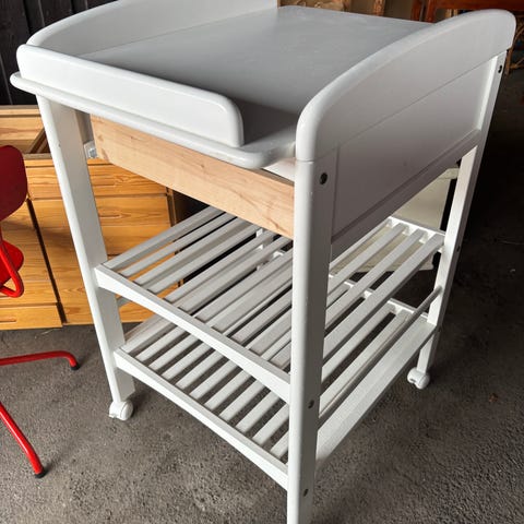 Troll skötbord i vitlackat trä. Skötbordet har en övre skötyta och två öppna hyllplan under för förvaring av blöjor, kläder och andra babyartiklar. Passar i barnrum eller badrum som praktisk skötplats. Skötbädd och förvaringslådor på bilderna kan vara separata tillbehör beroende på annonsens innehåll.