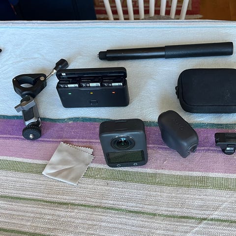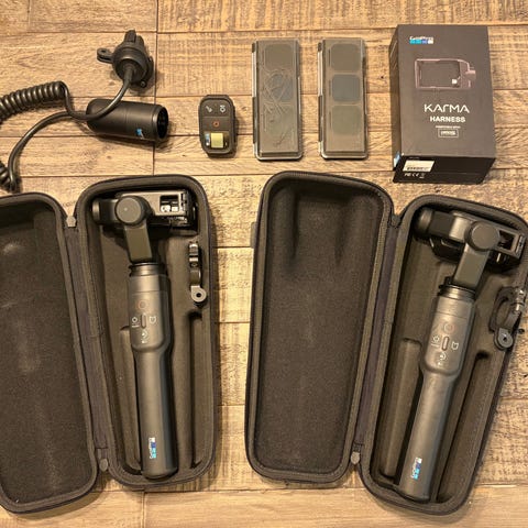 DJI Osmo Action 5 pro actionkamera med flera tillbehör. På bilden syns bland annat originalförpackning, extra batterier, skyddsfodral, ram/fäste, vattentätt hus, handtag/selfiestick, laddare och sele/fäste för montering på kropp eller utrustning. Kameran är avsedd för inspelning av foto och video i olika miljöer, inklusive utomhus- och sportaktiviteter. Passar för användning med de medföljande fästena för flexibel montering.