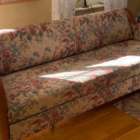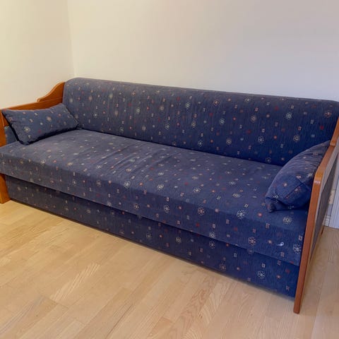 Äldre bäddsoffa från mitten av 70-talet. Omklädd. Två sängplatser, en i soffan, en i utdragssäng.
