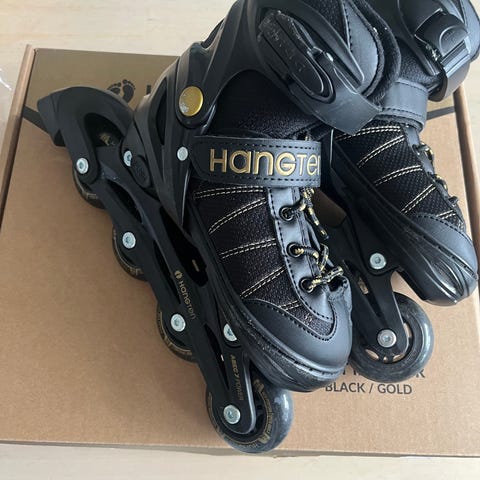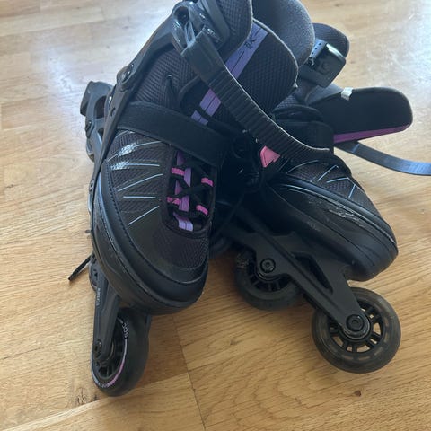 SOC J EXP70 inlines för barn, storlek 35 (justerbart spann 35–38 enligt förpackning). Färg svart med blå detaljer. Modell med fyra hjul på rad och justerbart spännsystem med remmar och spännen. Lämpliga för rullskridskoåkning och inlinesåkning på asfalt och andra släta underlag.