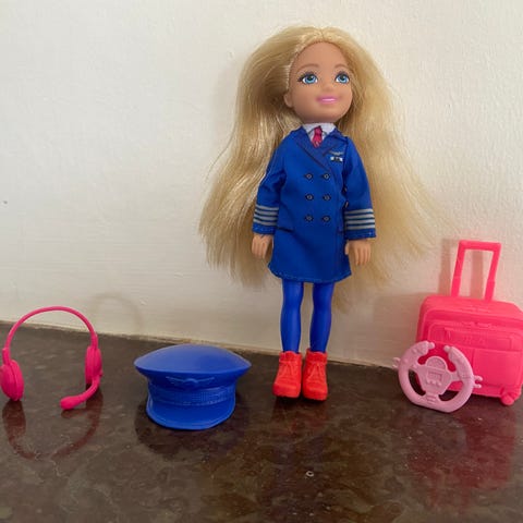 Barbie pilot med blå kostym, kjol, byxor, skor och resväska.