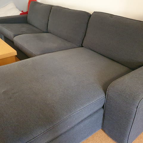 Fin antracit-grå modulsoffa med schäslong utan hål eller fläckar. Klädseln är av ett material som lämnar lite avtryck när man rör vid det, just det här materialet har utgått från IKEAs katalog men eftersom soffan fortfarande säljs går det att hitta ny om man vill byta.