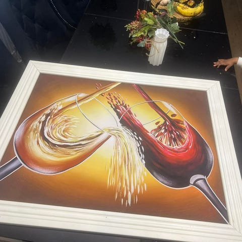 Tavla med cafémotiv föreställande en kaffekopp, sockerbitar och kex i relief. Rektangulär ram med upphängningsanordning på baksidan för väggmontering. Passar som väggdekoration i kök, caféhörna eller vardagsrum. 45cm*56cm