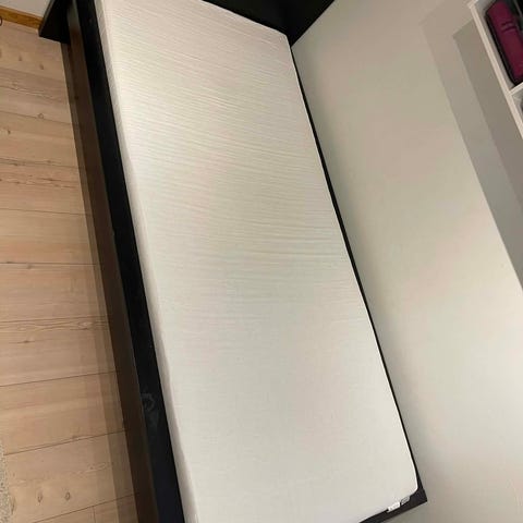 Jysk Resårbotten/ svart säng inklusive madrass till. Sängen har tygklädd sängram med ben och en vit madrass ovanpå. Madrassen har ett textilmönstrat överdrag och det finns en synlig fläck på ytan enligt bild (går säkert att få bort). Passar som enkelsäng i sovrum, gästrum eller liknande utrymme. Inget fel alls på sången. 120x200cm. Nypris på sängen är ca 7000. Endast hämtning på Södermalm. Kan möjligtvis gå ner i pris vid snabb affär.
