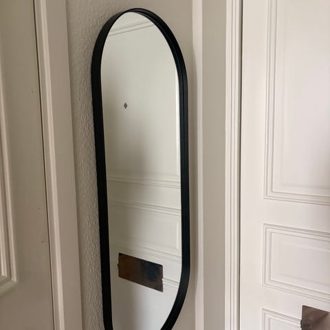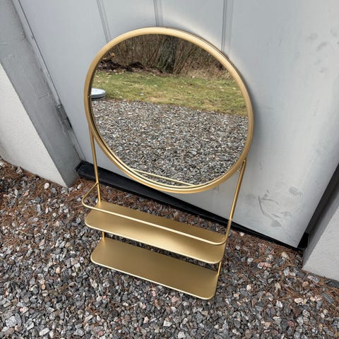 Rektangulär spegel som kan användas både som fristående spegel på bord eller hylla och som väggspegel. Spegeln har svart ram i metall och en hylla längst ner. mått: 40 x 80 cm. Pris: 150:-