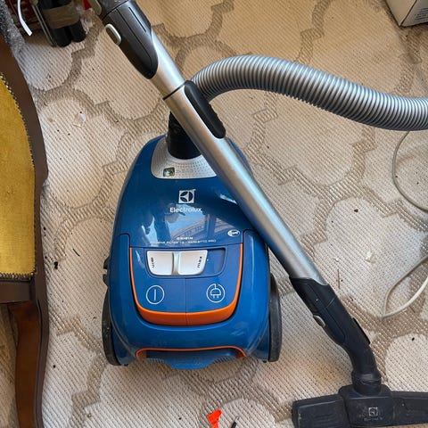 Electrolux UltraSilencer dammsugare i blå färg. Modellen är en traditionell golvdammsugare med slang, teleskoprör och kombimunstycke för golv och mattor. Reglerbar effekt via vred på ovansidan av enheten. Dammsugaren använder dammsugarpåse (synlig lucka för påsbyte). Passar för städning av olika typer av golvytor i hemmet.