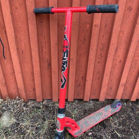 Sparkcykel i trickmodell i svart färg. Modellen har T-format styre med greppvänliga handtag och kompakt deck anpassat för enklare trick och åkning i skatepark eller på plana ytor. Utrustad med små hårda hjul som ger låg rullmotstånd och stabilitet vid hopp och svängar. Passar barn och ungdomar som vill ha en enklare trick- eller stuntinriktad sparkcykel för fritidsåkning. 78cm hög vid styret. Funkar bra