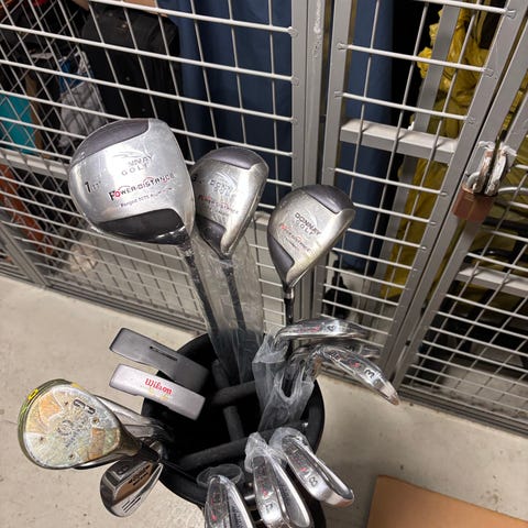 Callaway golfset DAM med bag och blandade klubbor. Setet innehåller flera järnklubbor samt olika typer av träklubbor och wedgar från Callaway och andra märken, enligt bilder. Golfbagen är en större modell i röd färg med flera fickor och bärremmar. Passar för spelare som söker ett komplett set med olika klubbor för varierat spel på banan.