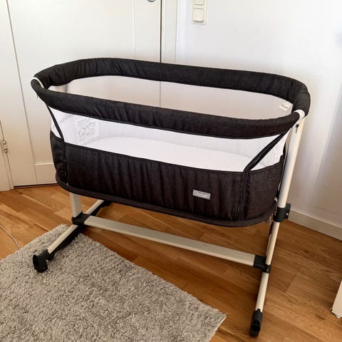 Obs: Som ny. Inköpt på jollyroom för 1299 kr. Enbart använd några gånger. Moweo bedside crib spjälsäng, upp till 9 kilo. Spjälsängen är avsedd att stå intill föräldrasängen och har en öppningsbar sida med meshfönster för insyn och ventilation. Stabil stomme med ben och hjul som underlättar förflyttning. Invändigt ljust tyg och madrass ingår enligt bild. Passar spädbarn under den första tiden, exempelvis vid amning och när barnet ska sova nära föräldrarna.