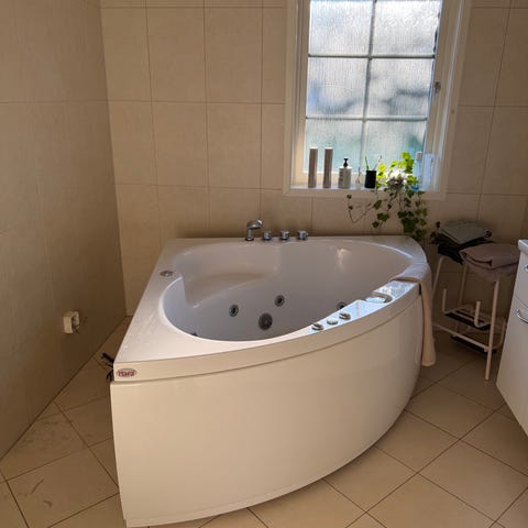 Hörnbadkar i gråvit gjutmarmor med löstagbar front