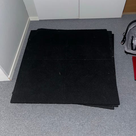 Svarta skumgummimattor i större kvadratiska bitar. Mattorna är tjocka och lämpar sig för exempelvis dämpning, isolering eller som underlag vid förvaring och transport. Säljs i flera likadana skivor enligt bild.