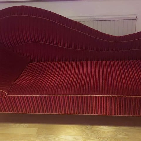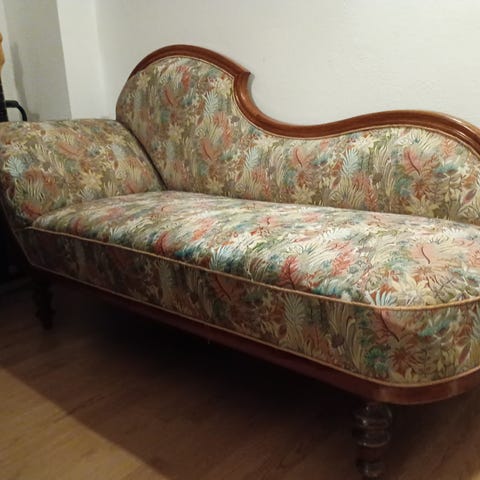 Schäslong i behov av omklädning men iövrigt fint skick. Fina trädetaljer.