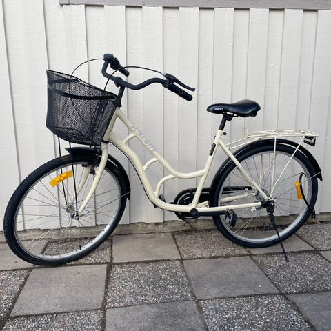 3 växlad barncykel med 24" hjul i vit färg. Utrustad med fotbroms och handbroms, framkorg, pakethållare bak, stöd och sadel i brun ton. Lämplig för barn som passar på en cykel med 24-tumshjul, exempelvis för vardagscykling till skola och fritidsaktiviteter. Nypris ca 3000 kr. Lite rost finns på cykeln.
