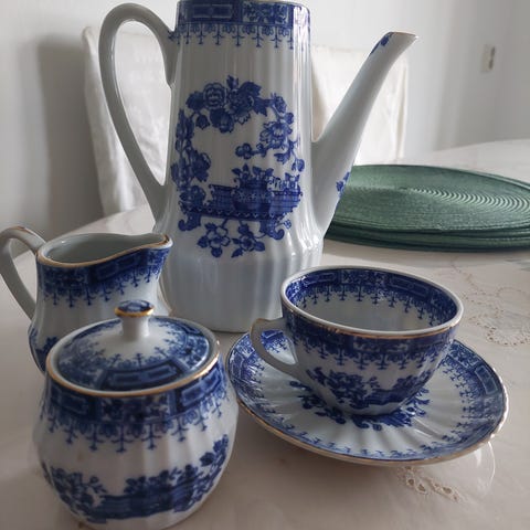 Kaffeservis i porslin med vackert rosmotiv och guldkant