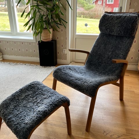 2 st fårskinnsfåtöljer Ulrik från Mio med fotpallar