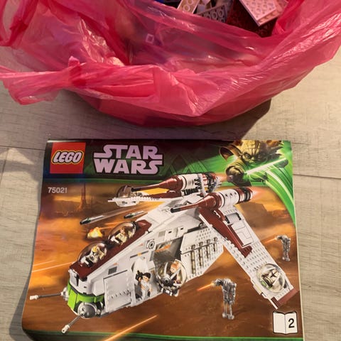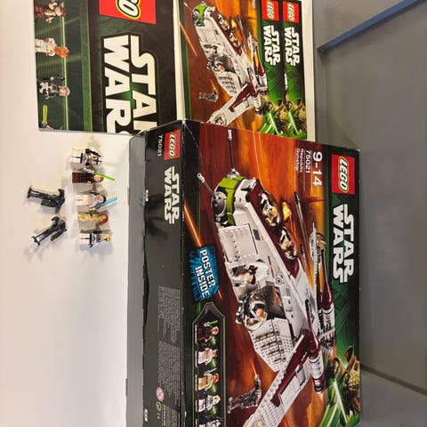 LEGO Star Wars rymdskepp med flera minifigurer. Modellen föreställer ett större transport- eller stridsskepp med öppningsbara sektioner och detaljerad cockpit. Flera figurer med ljussablar och klonrustning ingår, vilket gör setet lämpligt för lek och uppbyggnad av Star Wars-miljöer. Passar för den som samlar på eller bygger med LEGO Star Wars.