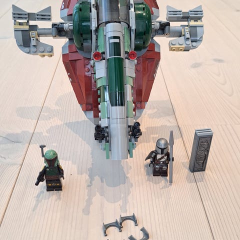 Suttit färdig byggt i en låda ett bra tag sedan den byggdes så har inte kvar lådan eller beskrivningen till skeppet. Tror inte det saknas något förutom Speedstern som man kan lägga in där bak annars är alla ”lösa” dela inkluderade.