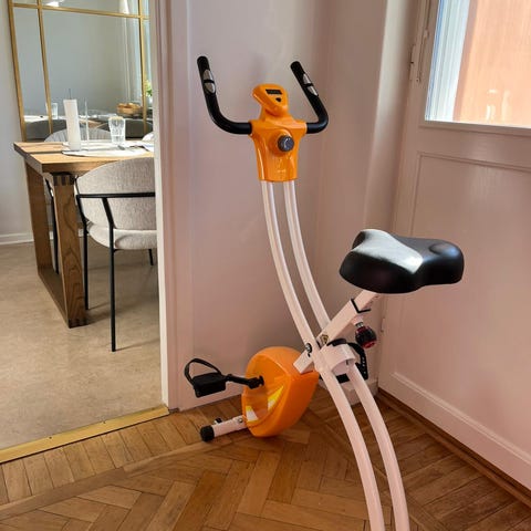 Biltema F001D motionscykel i hopfällbar modell. Cykeln har orange ram med vit stativdel och svart sadel samt pedaler. Utrustad med digital display som kan visa bland annat tid, distans, hastighet och kaloriförbrukning. Maximal användarvikt är 110 kg enligt märkning. Drivs med 3,0 V strömkälla. Lämplig för hemmaträning och enklare konditionsträning inomhus.