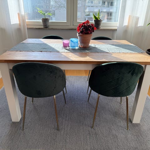 Finns iläggsskiva 60 cm som viks upp och ligger under bordsskivan. Längd 145 cm + 60 cm. Benen bortskruvade själva skivan är tung.