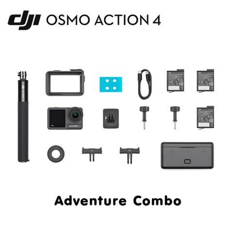 Standard Combo innehåller DJI Osmo Action 3 actionkamera, 1 uppladdningsbart batteri, självhäftande bas, låsskruv, gummilinsskydd, Type-C till Type-C PD-kabel, horisontell-vertikal skyddsram och quick-release adapterfäste.